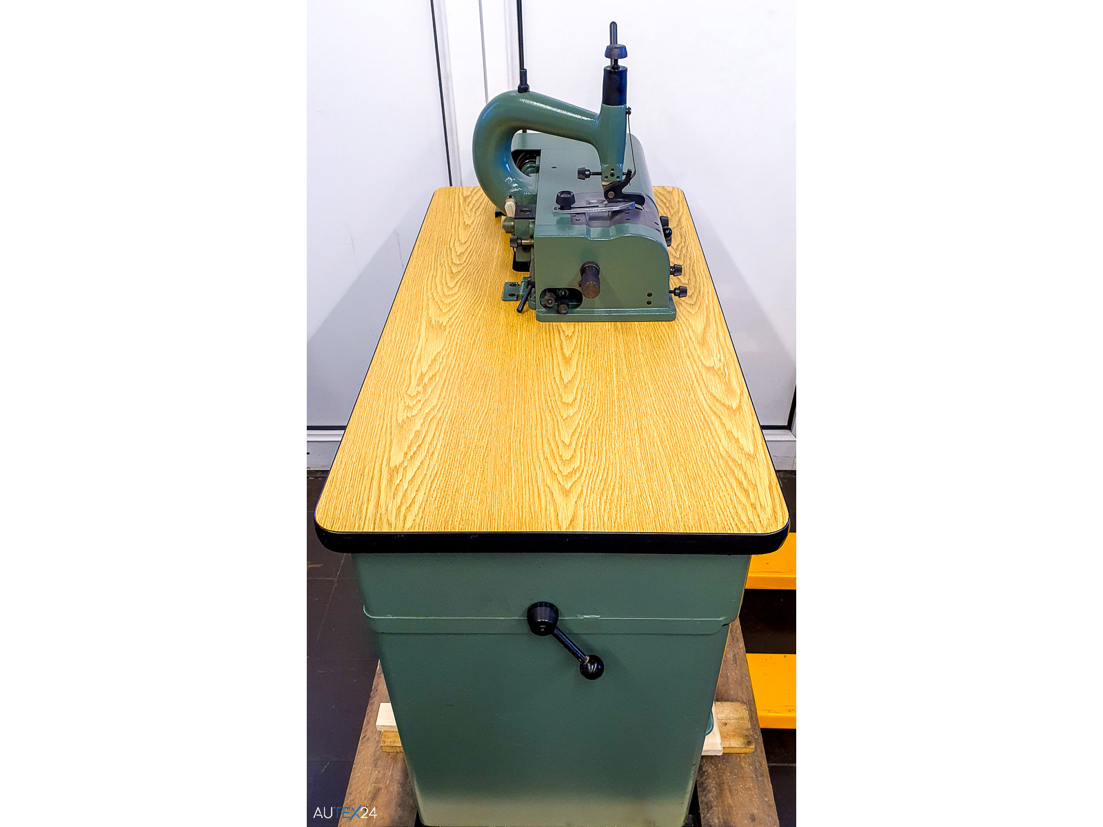 Komplett auf Gestell für Arbeitsbreiten bis 50 mm, samt angetriebener Führungsrolle mit exakt regulierbarer Vorschubgeschwindigkeit über eingebaute Kupplung, automatische Absaugung inkl. Spänekasten und einem leistungsstarken 380 V / 550 W Starkstrommotor