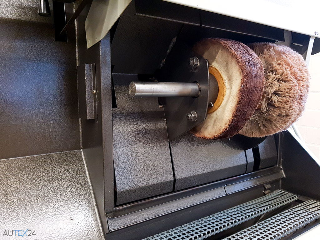 Poliermaschine mit mechanisch umschaltbarer Revolverpoliereinheit mit 3 Wellen, Revolver-Schnittpolierabteilung mit 5 umschaltbaren Wellen, samt integriertem Absaugsystem mit Baumwoll- und Feinfilter und frontal herausnehmbare Grob- und Feinstaubkästen