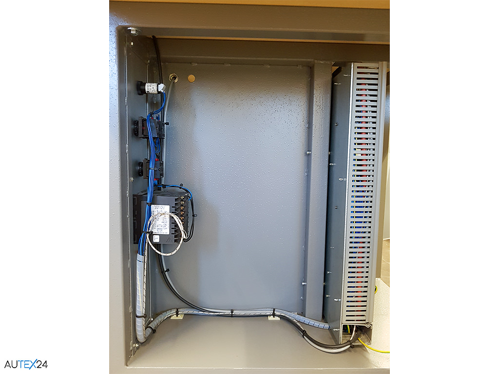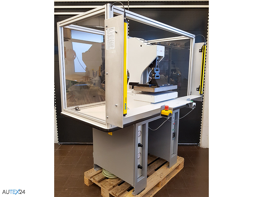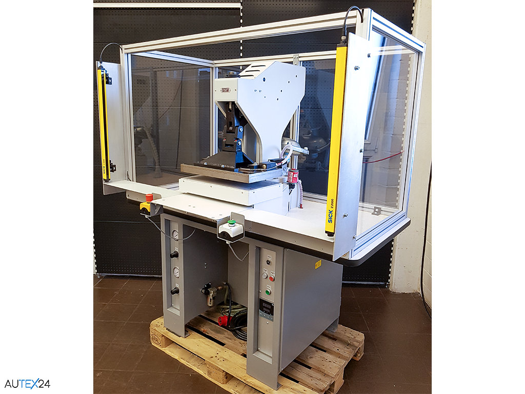 Präzise und robuste elektropneumatisch / halbautomatische Heißprägemaschine mit einem maximalen Prägedruck von 5 t (0 – 50 kN), einer Prägefläche von 480 x 250 mm, einer Prägetemperatur 0 – 250 °C