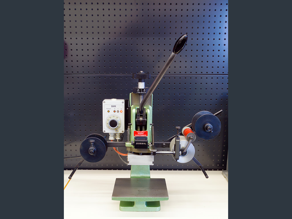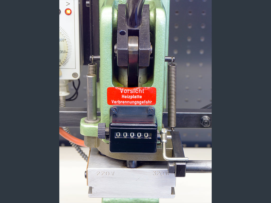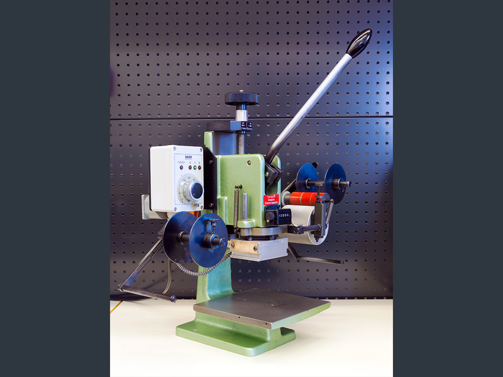 Precise and robust manually operated hot stamping machine with a maximum stamping pressure of 600 kg (0 - 6 kN), a stamping plate of 70 x 90 mm, temperature control unit, 5-digit piece counter, height measuring scale and automatic foil feeding device