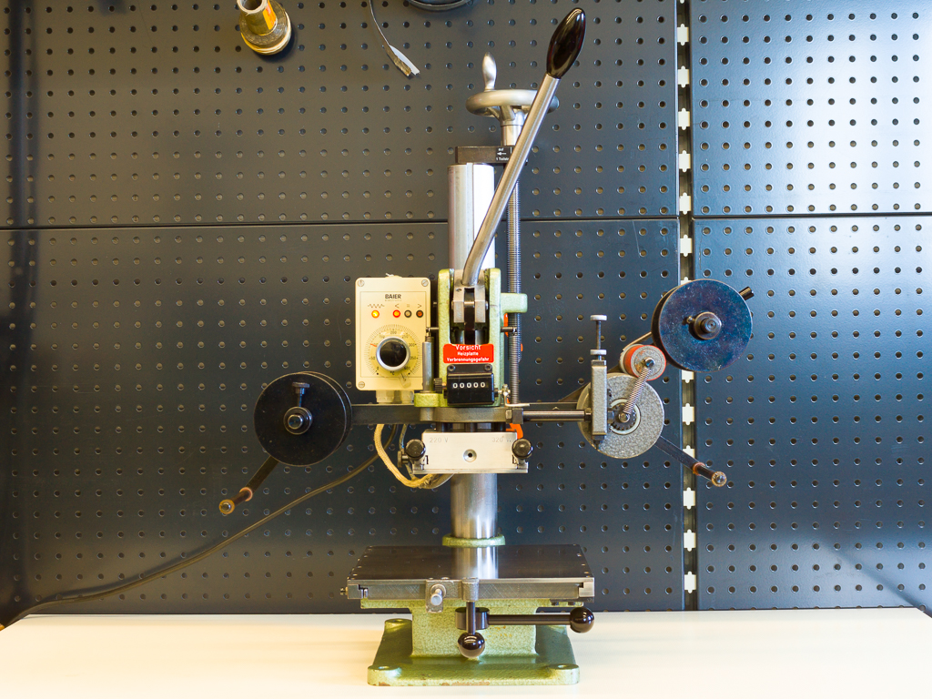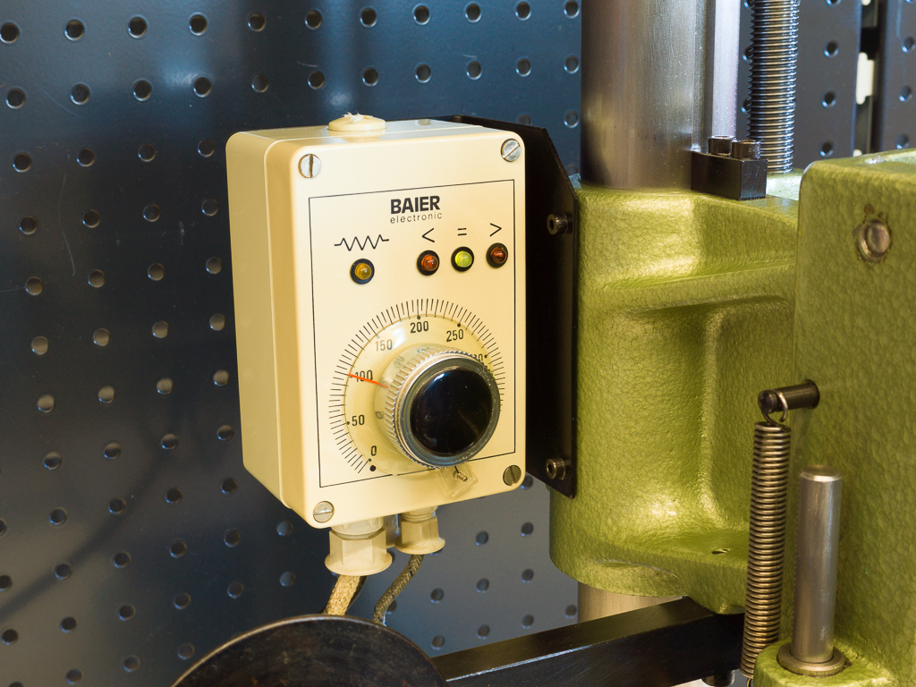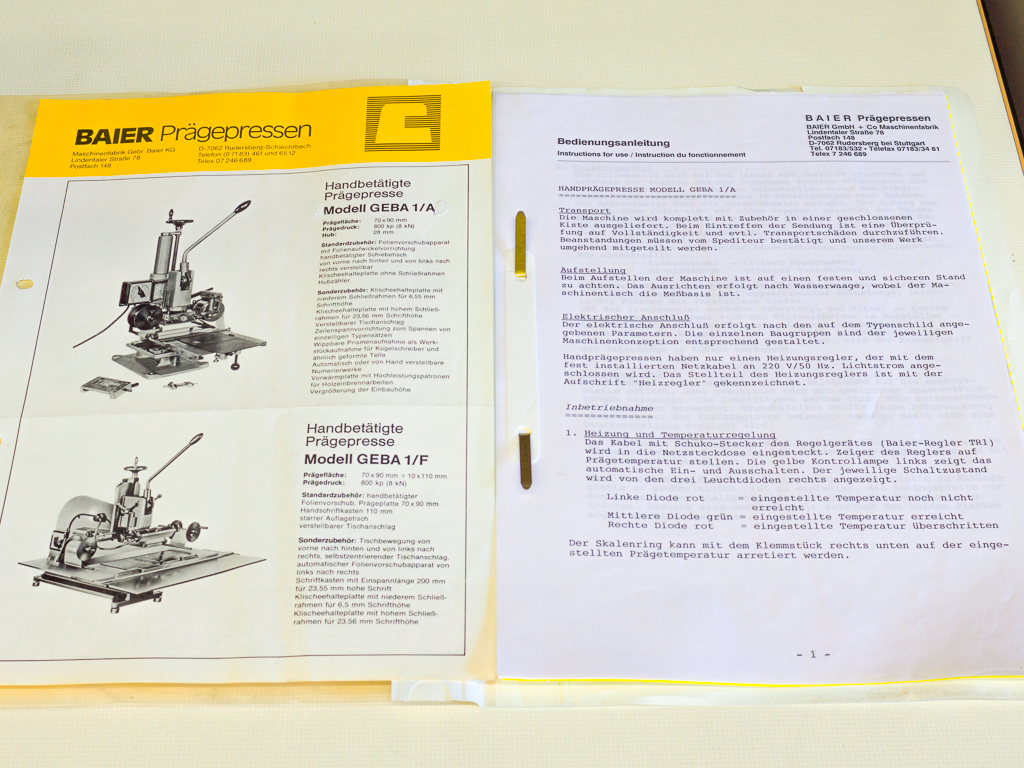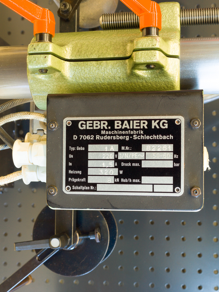 The Baier Geba 1/A hot stamping press is in good used condition, fully functional, cleaned and ready for immediate use. The optical condition can be seen in the attached pictures and videos. An inspection and detailed examination of the purchased item, is expressly desired by arrangement.