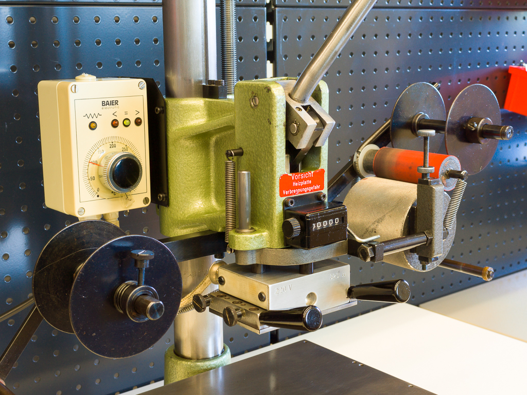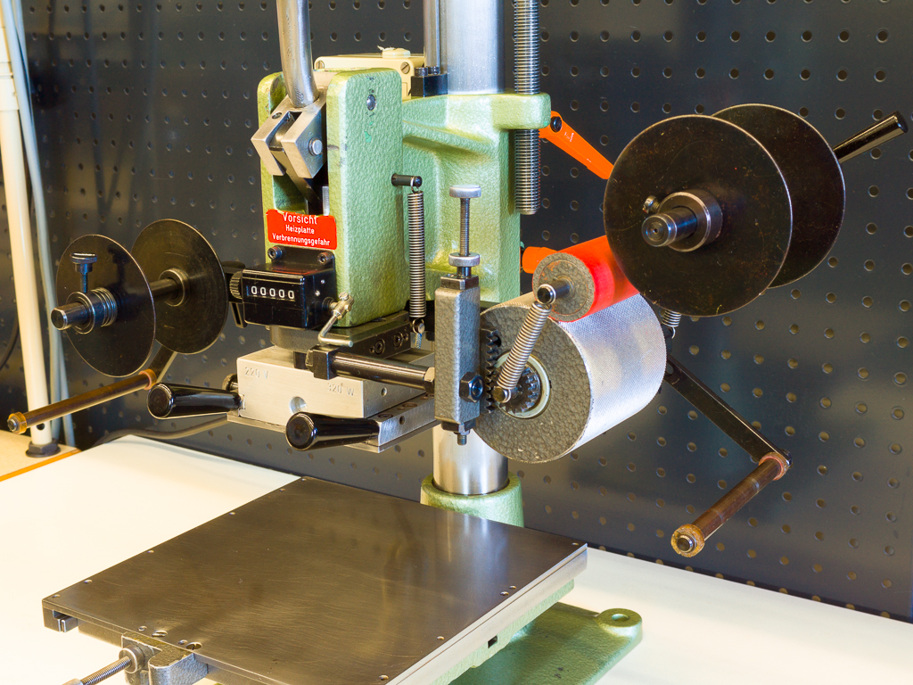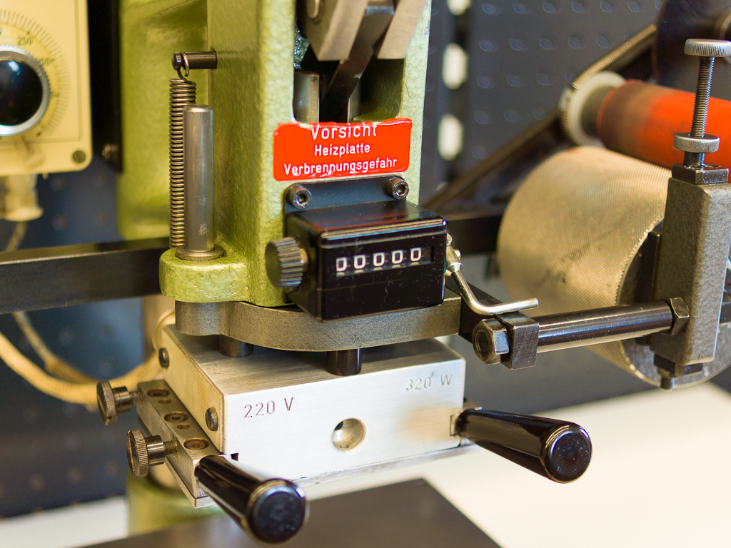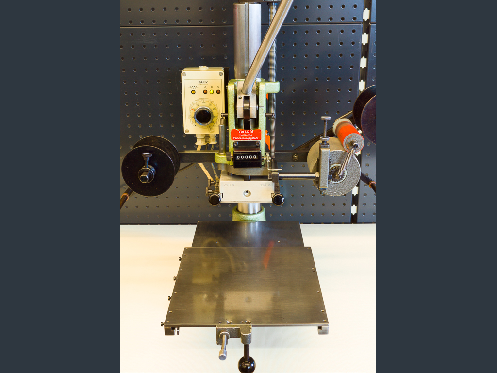 Precise and robust manually operated hot stamping machine incl. cliché holding plate with a maximum stamping pressure of 800 kg (0 - 8 kN), a stamping plate of 70 x 90 mm, temperature control unit 0 - 400 °C, 5-digit piece counter, with extendable work table of 230 x 220 mm as well as an automatic foil feeding device