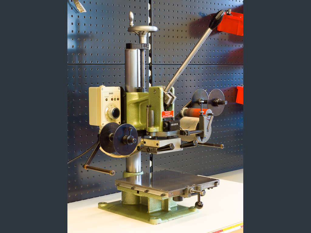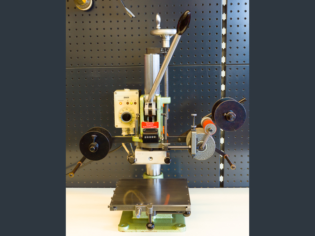 The embossing machine is equipped with a 230 × 220 mm work table that can be moved in all directions and has a throat depth of 110 mm and an insert height of 0 - 180 mm.