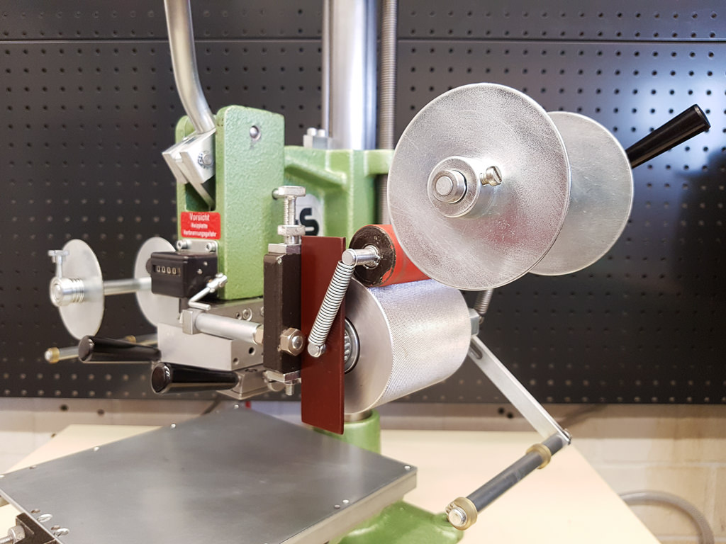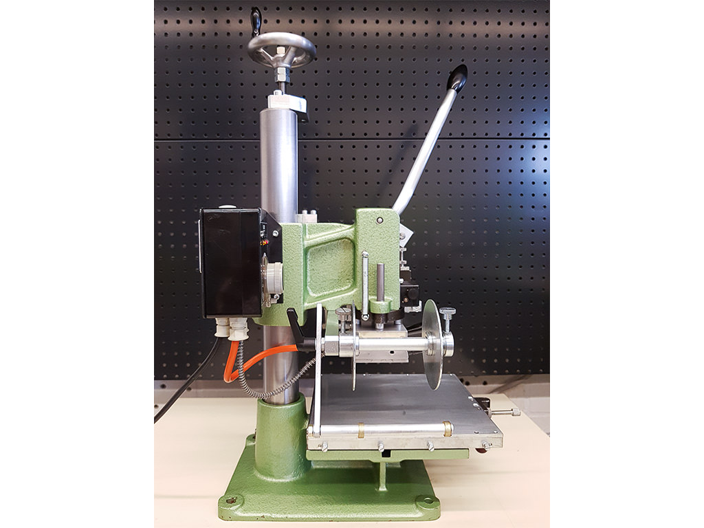 The embossing machine is equipped with a 230 × 220 mm work table that can be moved in all directions and has a throat depth of 110 mm and an insert height of 0 - 180 mm.