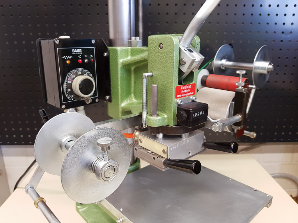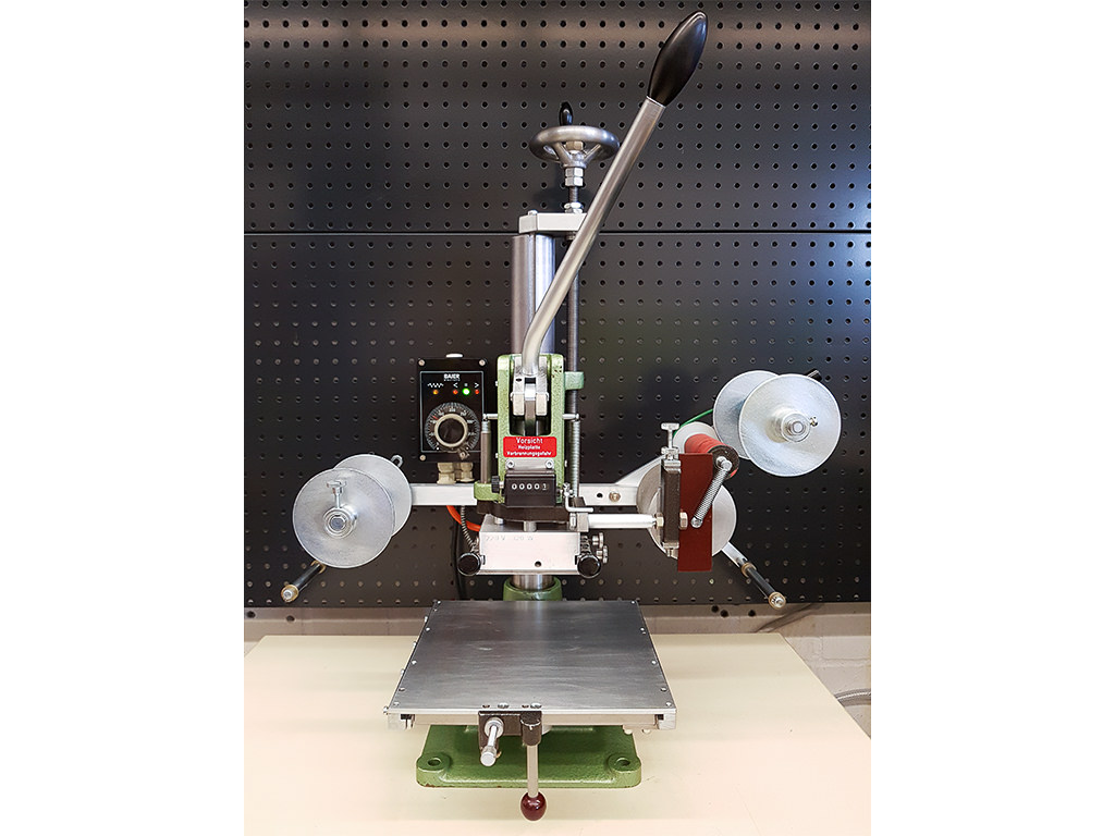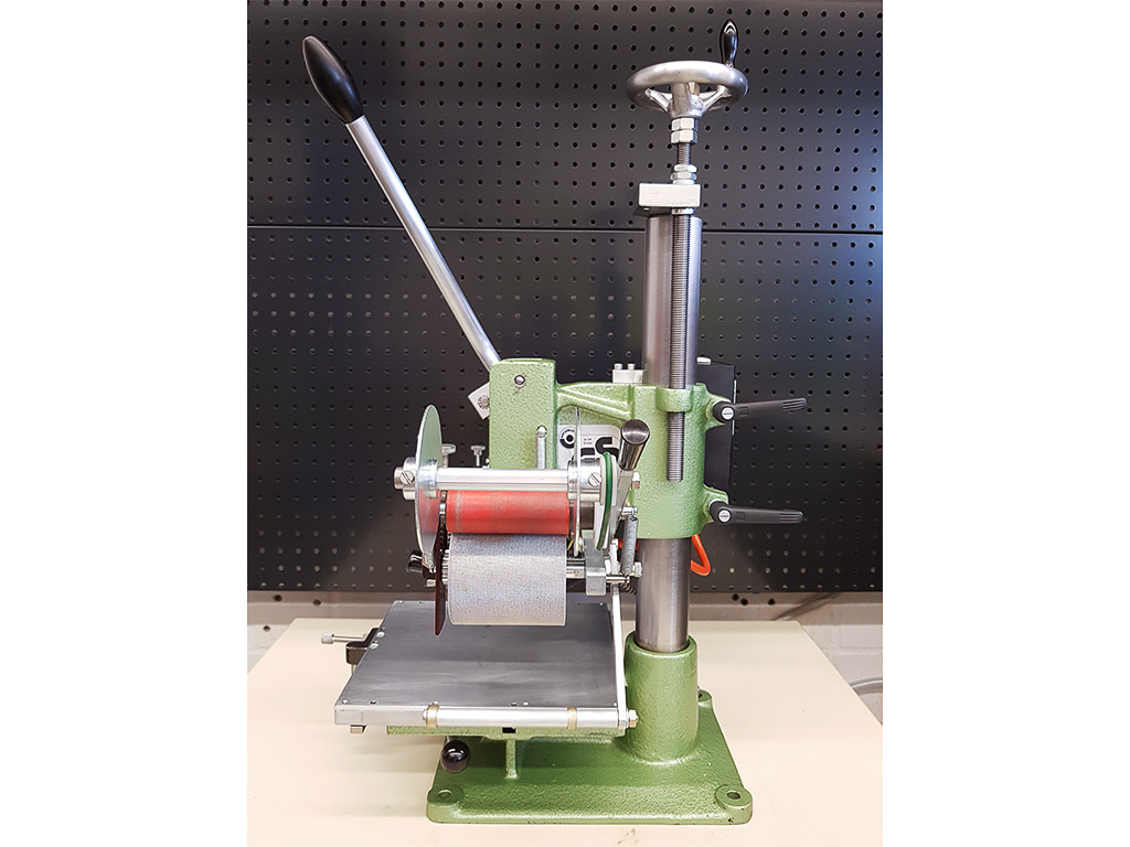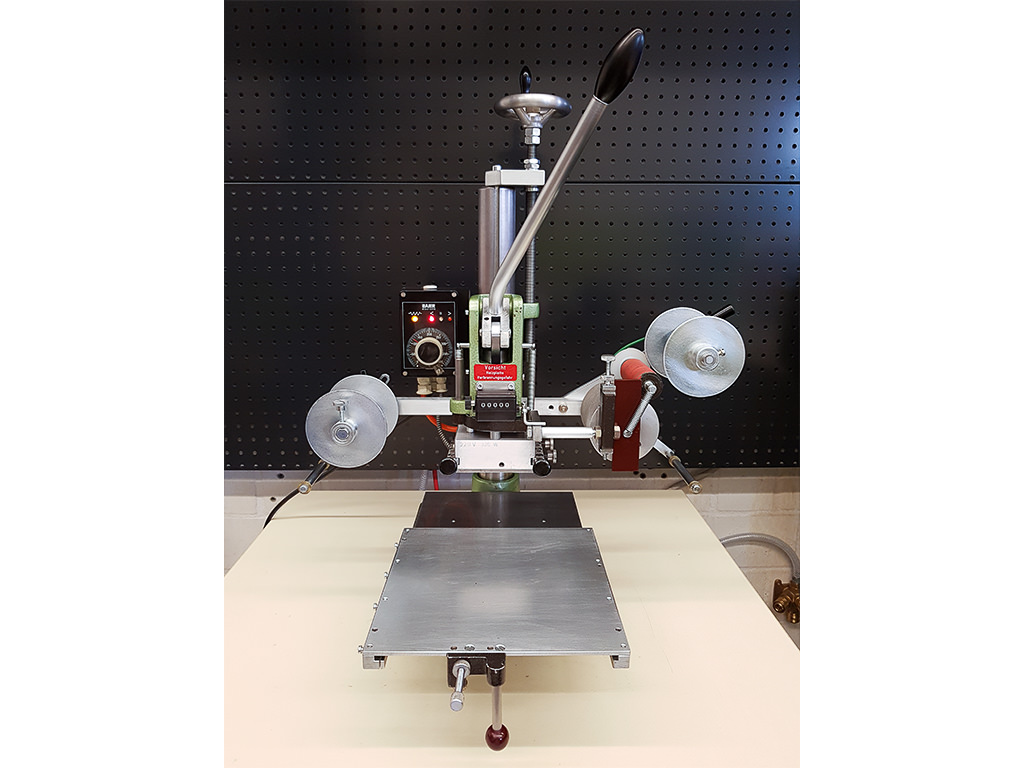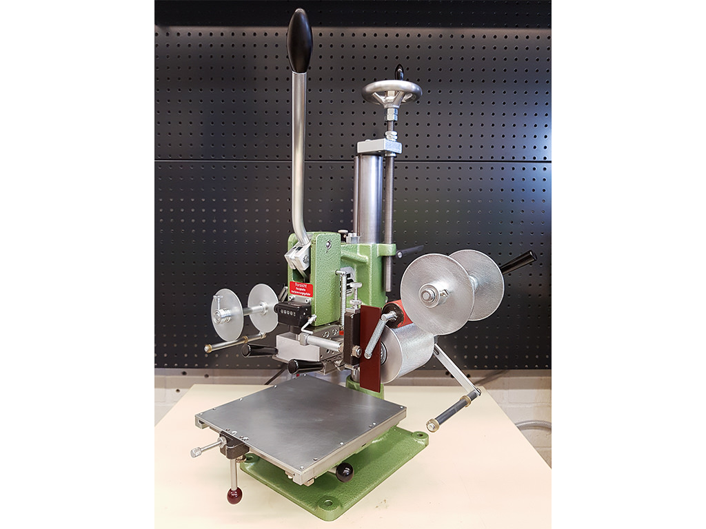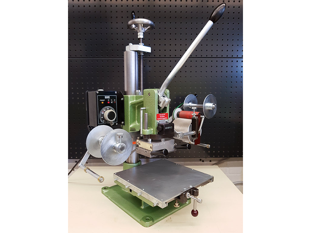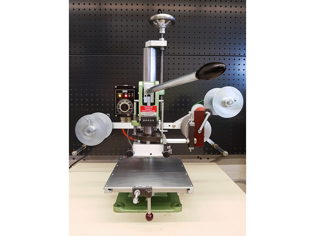 Precise and robust manually operated hot stamping machine incl. cliché holding plate with a maximum stamping pressure of 800 kg (0 - 8 kN), a stamping plate of 70 x 90 mm, temperature control unit 0 - 400 °C, 5-digit piece counter, with extendable work table of 230 x 220 mm as well as an automatic foil feeding device