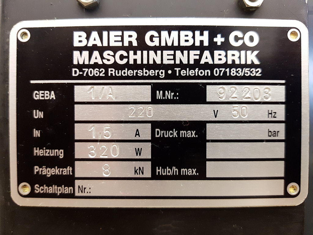 The Baier Geba 1/A hot stamping press is in good used condition, fully functional, cleaned and ready for immediate use. The optical condition can be seen in the attached pictures and videos. An inspection and detailed examination of the purchased item, is expressly desired by arrangement.