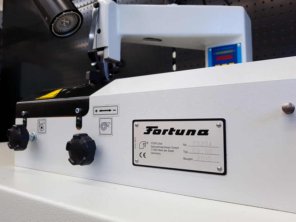 Complete on frame for working widths up to 50 mm, digital knife position display, year 2010, driven guide roller with exactly adjustable, stepless, electronic feed speed and modified automatic suction incl. chip box, original Fortuna work light and a powerful 380 V high-voltage motor