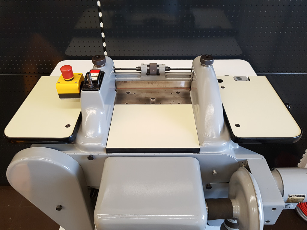 The universal bandknife splitting machine combines the advantages of roller and ruler guidance with a changeover time of only two minutes. It has a maximum splitting width of 305 mm. Splits of 0.4 - 5 mm are possible with the maintenance-free guide roller and splits of 0.1 - 5 mm with the guide ruler. The splitting thickness is set on the easily accessible handwheel with a micrometer scale (1/10 mm graduation).