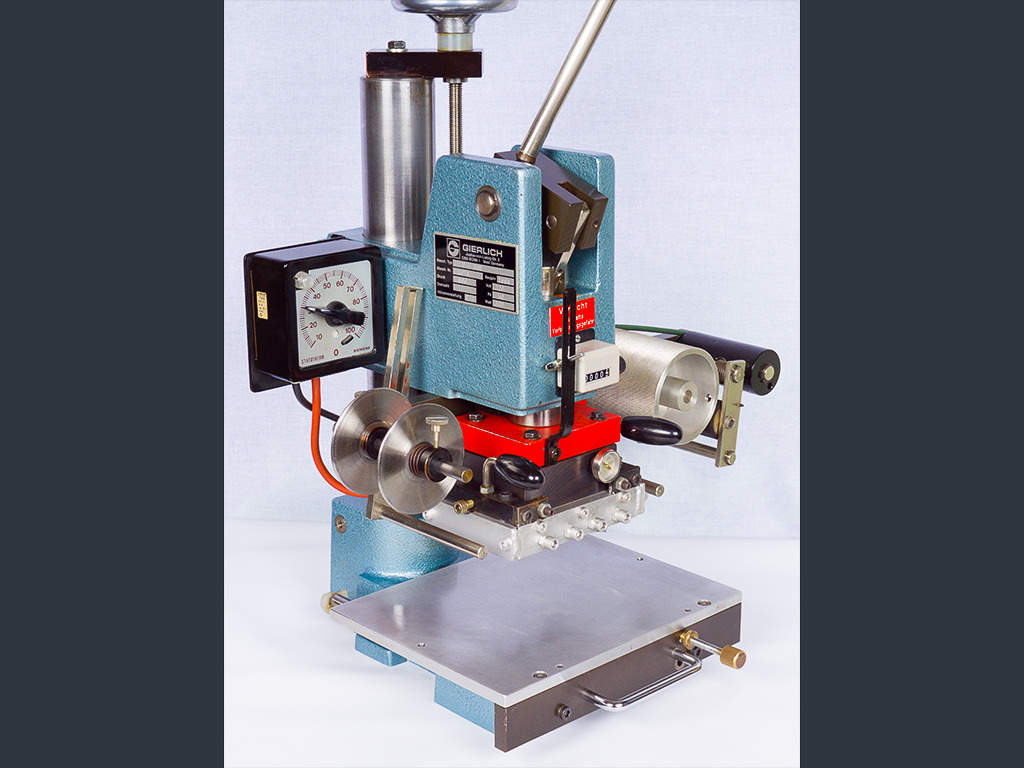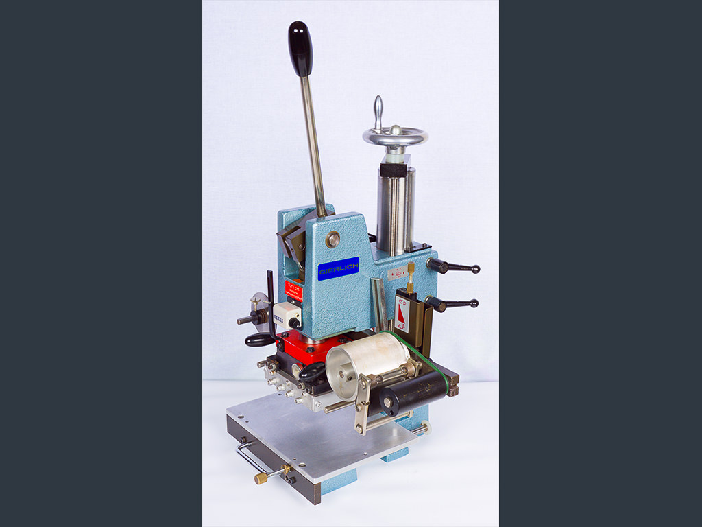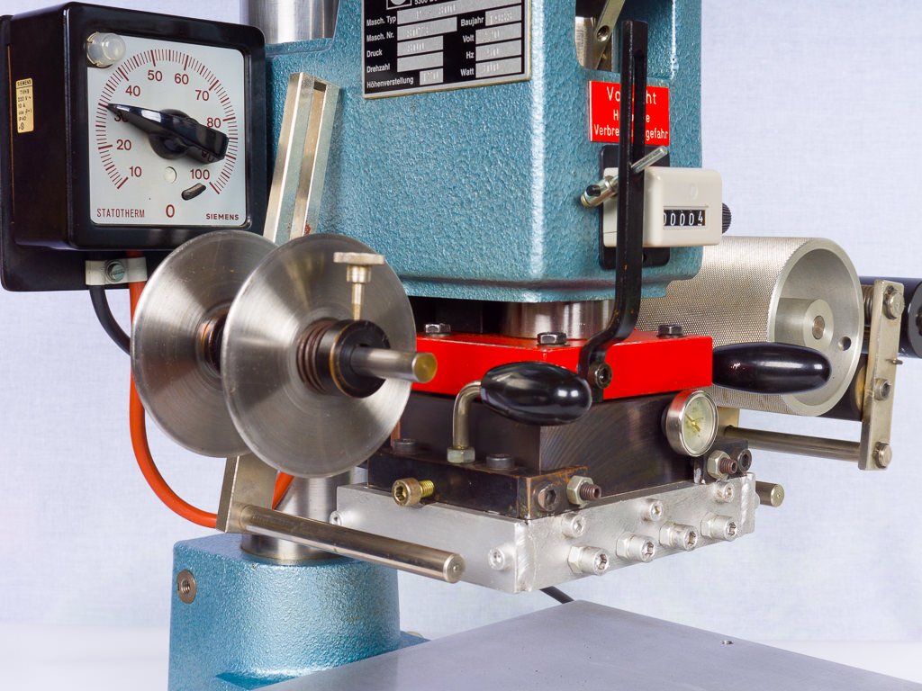 Due to the automatic foil feeding device, it can be used for foil stamping as well as for blind stamping. The foil feed is designed for a foil width of max. 90 mm whereby the foil transport length can be set between 10 and 130 mm.
