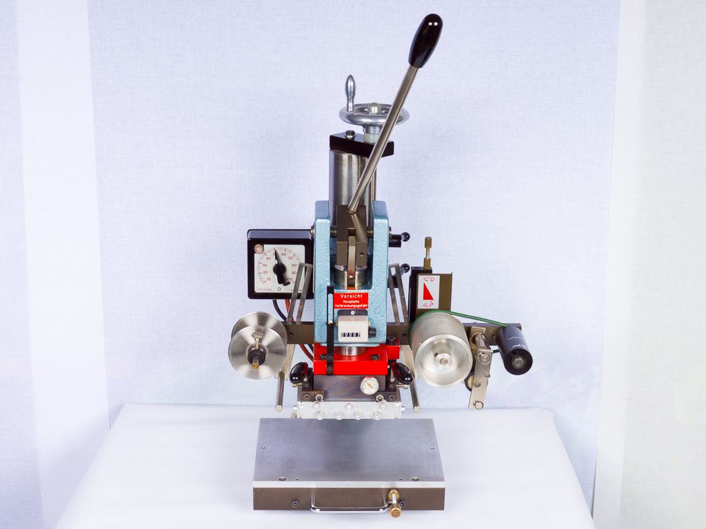 Precise and robust manually operated hot stamping machine with a maximum stamping pressure of 800 kg (0 - 8 kN), a stamping plate of 75 x 120 mm incl. closing frame 75 x 130 mm, temperature control unit 0 - 350 °C, 5-digit piece counter, height measuring scale, with extendable work table of 200 x 260 mm as well as an automatic foil feeding device