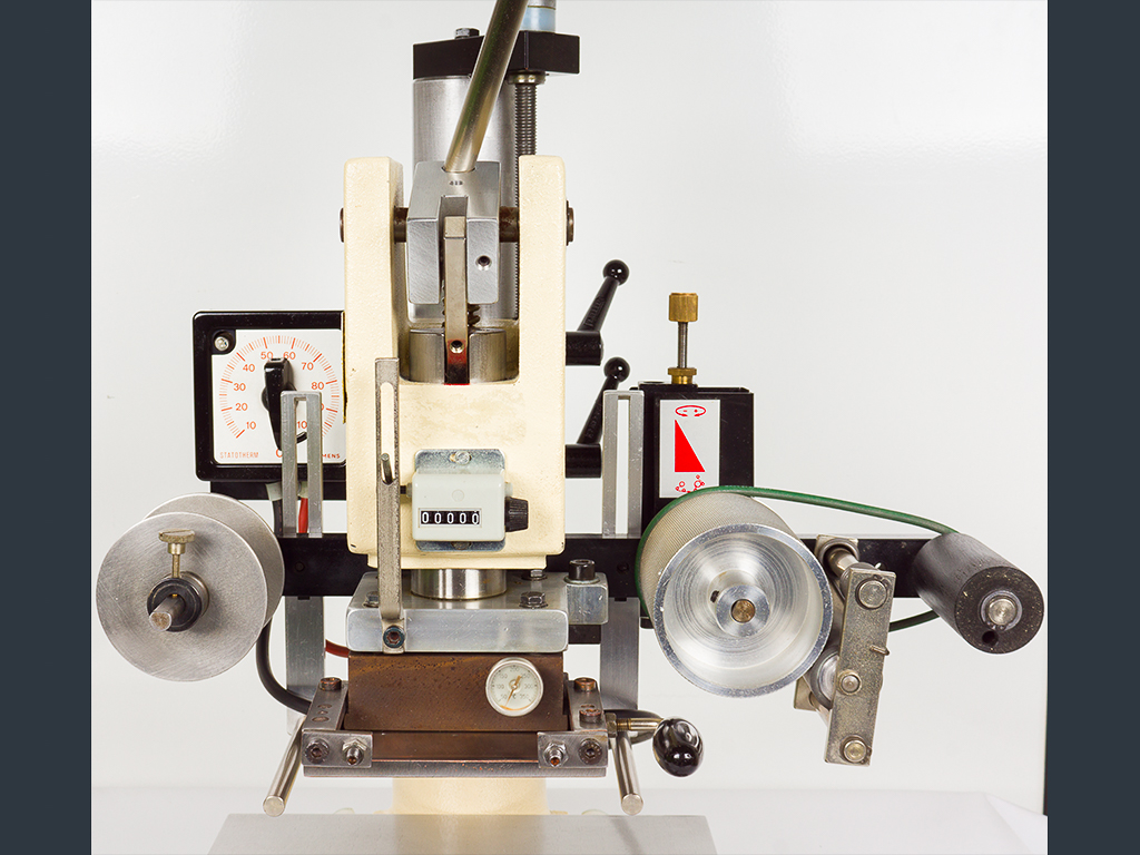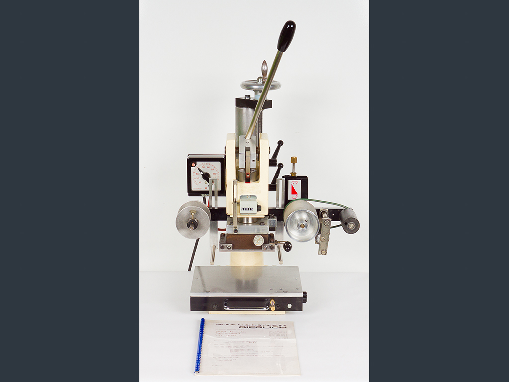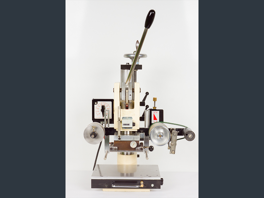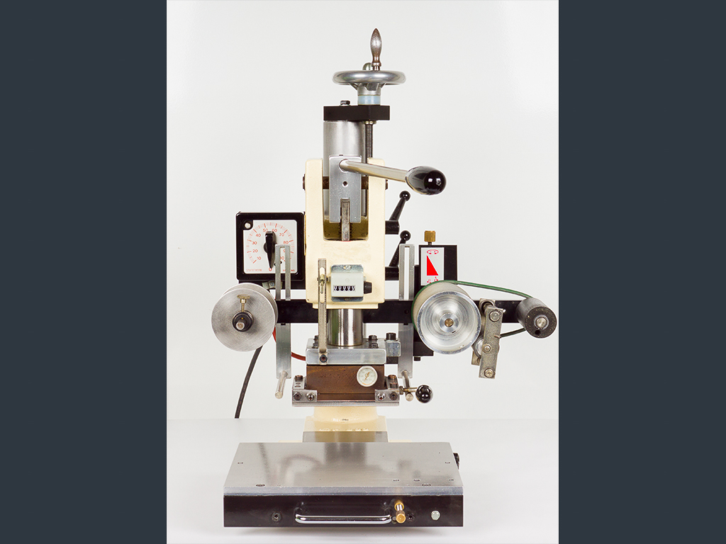 Due to the automatic foil feeding device, it can be used for foil stamping as well as for blind stamping. The foil feed is designed for a foil width of max. 90 mm whereby the foil transport length can be adjusted between 10 and 130 mm.