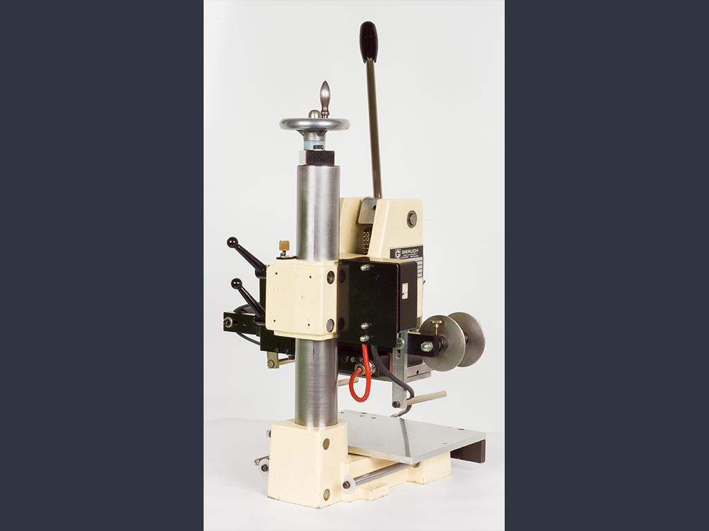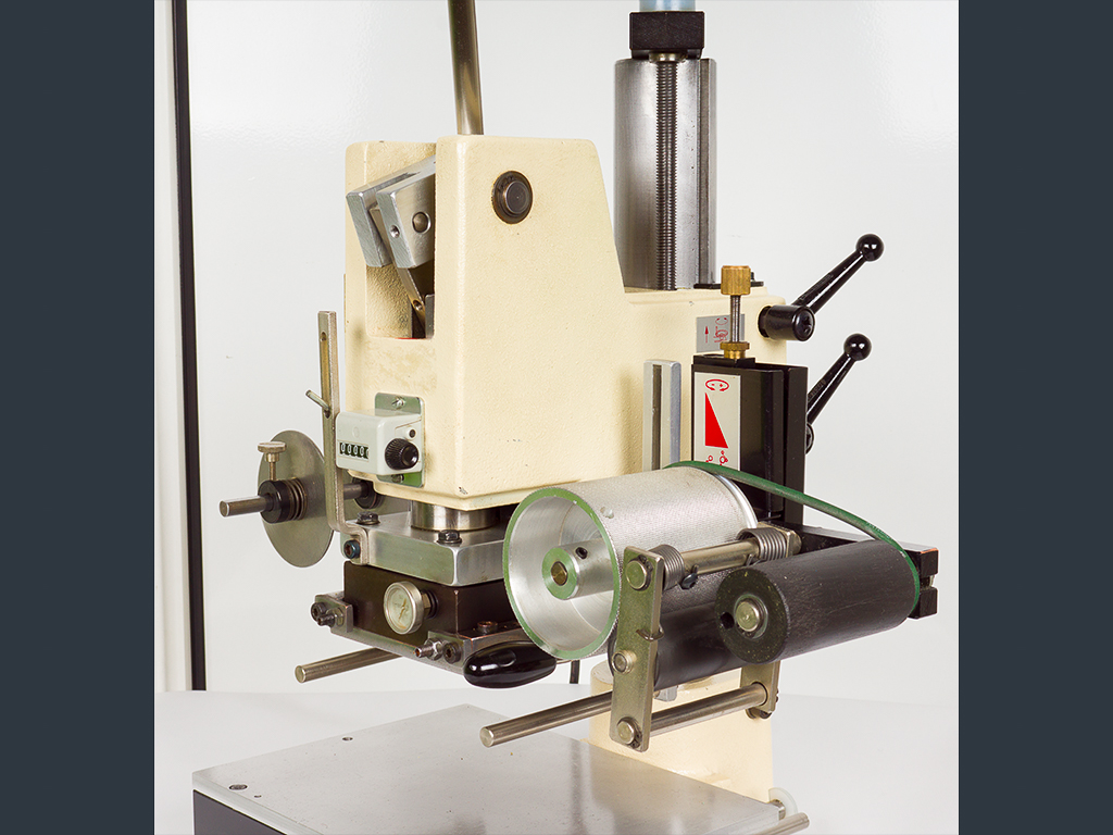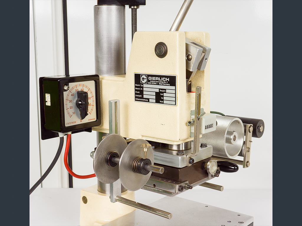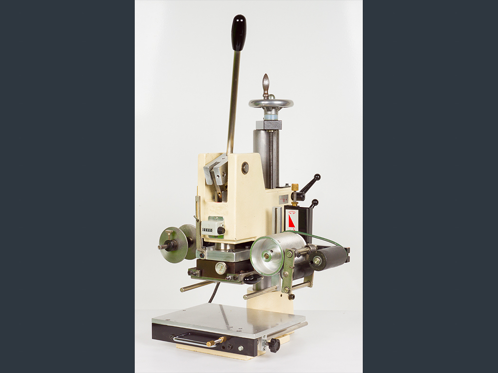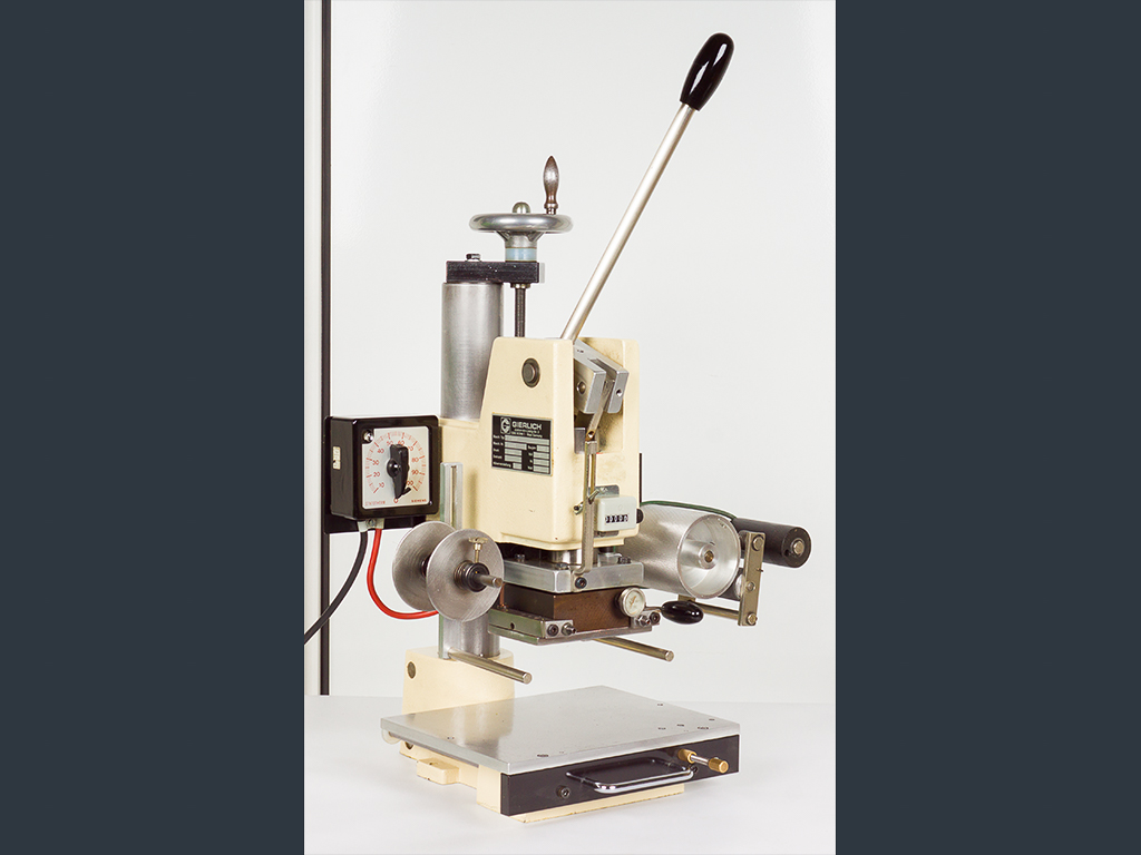 Due to the automatic foil feeding device, it can be used for foil stamping as well as for blind stamping. The foil feed is designed for a foil width of max. 90 mm whereby the foil transport length can be adjusted between 10 and 130 mm.